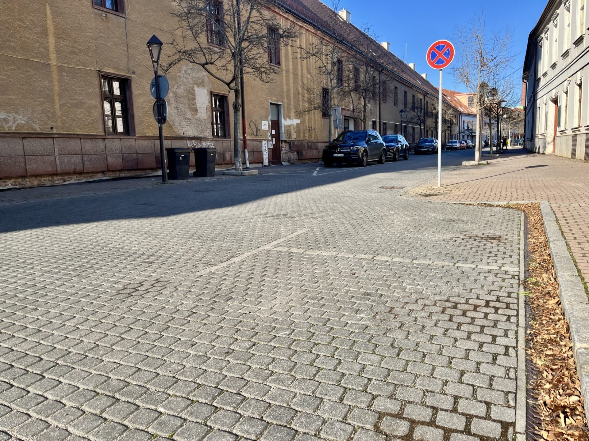 Časť Františkánskej ulice legálne parkovanie umožňuje. Ide o úsek, kde je zámková dlažba nastriekaná výraznou bielou farbou podľa technických noriem, aby jasne označovala parkovacie miesto v centrálnej zóne. Vodiči by si preto mali dôsledne všímať, kde končí riadne schválené vodorovné značenie a kde už ide len o farebne odlíšený povrch chodníka, aby sa vyhli zbytočným nedorozumeniam aj pokutám.